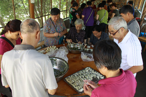 此次活動(dòng)共有120多名體協(xié)會員參加,大家都想借此機(jī)會和大自然來個(gè)親密接觸,體協(xié)委員利用休息時(shí)間為大家采購了豐富美味的食物。利用新世紀(jì)綠草地依山伴水的地理資源優(yōu)勢,在秋日和煦的陽光下,在風(fēng)景秀麗的南明湖邊,我們老年人在綠草地上展現(xiàn)了 “年輕人”舞步,跳著佳木斯健身操動(dòng)作,擺動(dòng)雙臂,邁開雙腳,走出健康,走出幸福。當(dāng)走進(jìn)餐廳看見桌子上擺好的餃子皮和餃子餡,老同志們便紛紛摩拳擦掌,躍躍欲試。他們各自分工后便熱火朝天的忙起來,現(xiàn)場笑聲不斷。