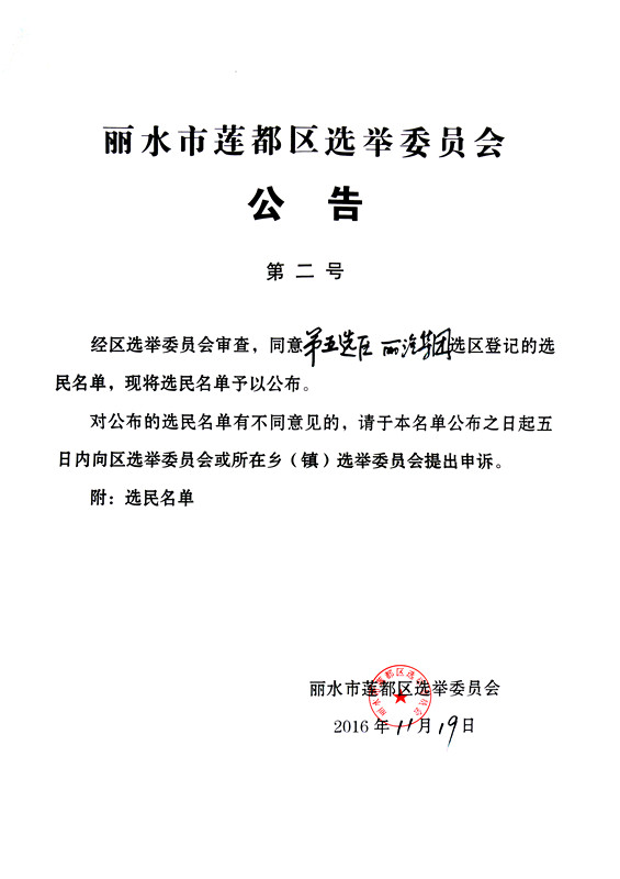 麗水市蓮都區(qū)選舉委員會(huì)公告( 第二號(hào) )