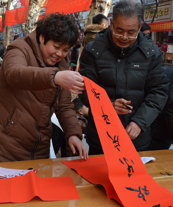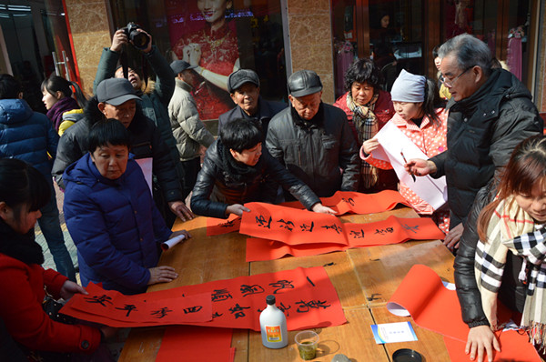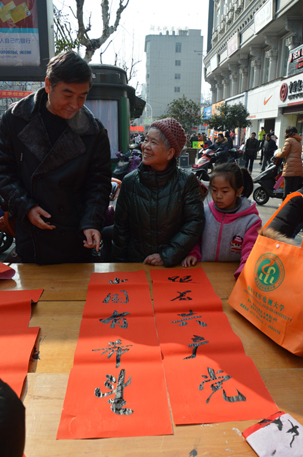 幾張小桌子拼成的簡易書案更是黨員一條街上靚麗的風景。三位老同志一落筆,書案旁邊一下子就圍滿了人,大家一邊排隊等候著“墨寶”,一邊點贊著三位老師的書法。葉女士高興地說:“手寫的春聯(lián)不僅更有年味,而且還是在弘揚中國的書法藝術。中國傳統(tǒng)的年俗文化,現(xiàn)在已經越來越難得了?!币粚﹄p胞胎寶寶的父母恰巧推著嬰兒車從服務點前經過,趕緊請老師寫下“開心寶貝”四個字,還說是給孩子倆最珍貴的新年禮物。