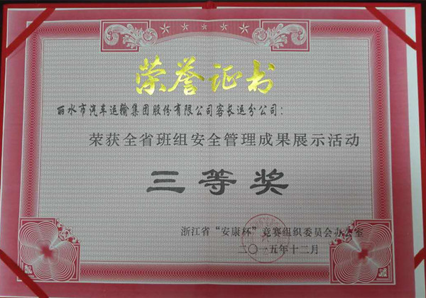 近日,浙江省“安康杯”競(jìng)賽組織委員會(huì)發(fā)布“2015年全省班組安全管理成果展示活動(dòng)評(píng)選結(jié)果的通報(bào)”,市總工會(huì)推薦報(bào)送的“麗汽集團(tuán)長(zhǎng)運(yùn)分公司班組安全管理成果展示”獲三等獎(jiǎng)。