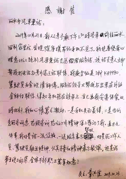 在手機(jī)失而復(fù)得后,失主的內(nèi)心萬分激動(dòng),在回到家后的第三天,他還是難以平復(fù)激動(dòng)的心情,于是就寫了這封感謝信。由于工作繁忙的他一直沒空將這封感謝信送到東站來。